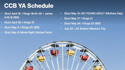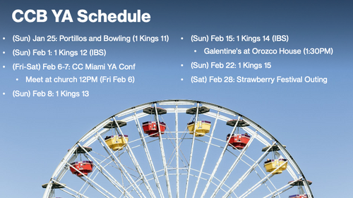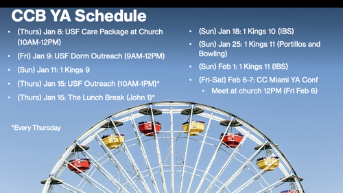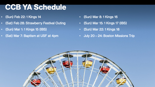 - Fellowship, worship, and studying through the Bible.